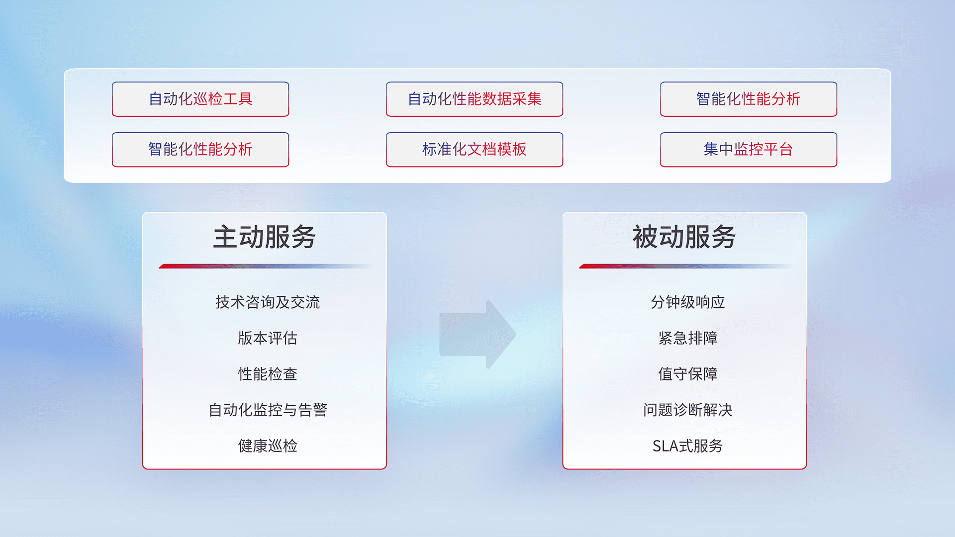 智能化工具和标准化文档,,,,保障服务质量,,,提供主动服务(包含技术咨询、、版本评估、、性能检查、、自动化监控与告警、、、健康巡检)和被动服务包含(分钟级响应、、紧急排障、、、、值守保障、、问题诊断解决、、、SLA服务)。。